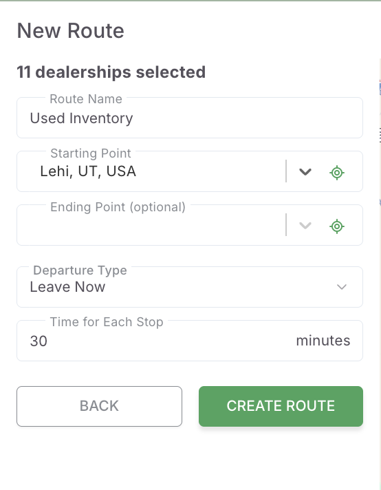- Adjust the Time at Each Stop to set how long you plan to spend at each dealership.