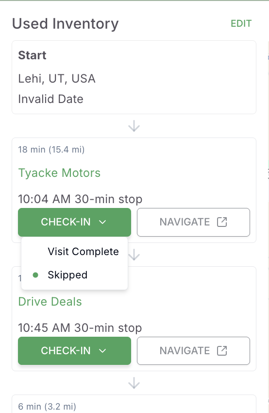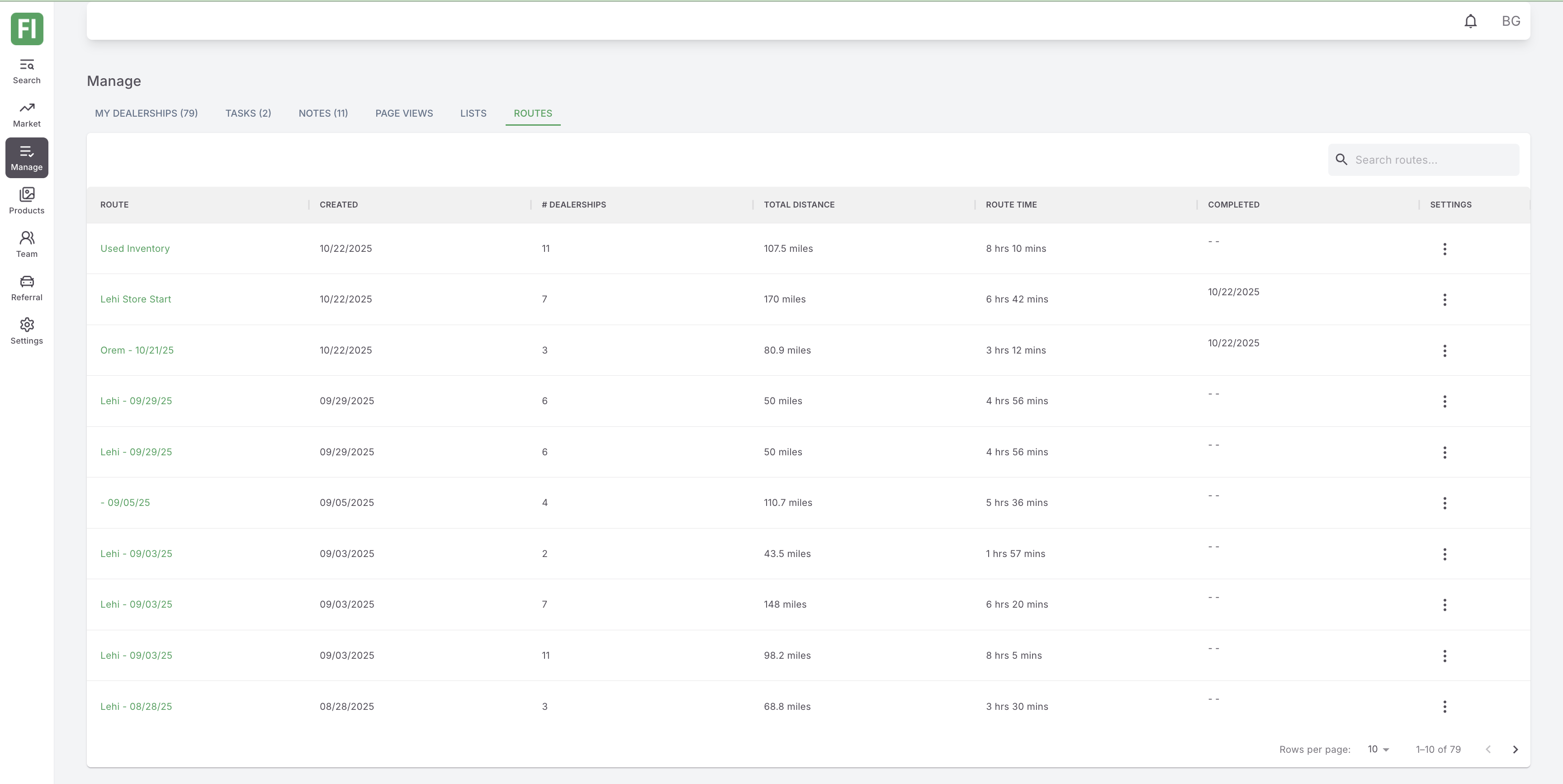 The Routing feature allows agents to plan dealership visits directly from the Territory Insights map. You can select dealerships, create optimized travel routes, check in at each stop, and log notes—all from a single workflow. Created routes automatically appear under Manage → Routes for future reference.