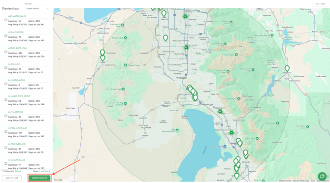 - From the results table, select the dealerships you want to visit using the checkboxes.