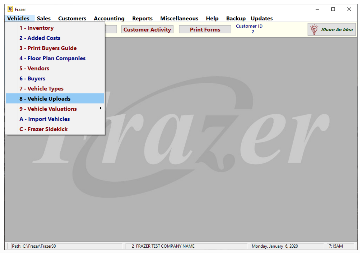 To add the port to Carketa from Frazer, Click Vehicles, then 8 – Vehicle Uploads: