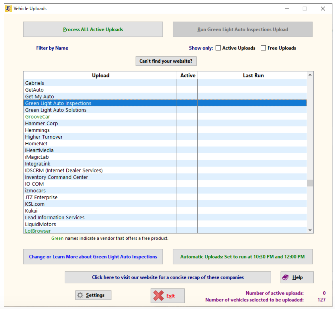 Vehicle uploads will be listed alphabetically with active uploads grouped at the top of the list. Be sure that the “Show only active uploads” box is not checked. Find the Carketa (Green Light Auto Inspections) upload (you can either scroll to it or use the “Filter by Name” field to find it). Double click Carketa or select it and then click the “Change or Learn More about Carketa” button to open the Setup screen.