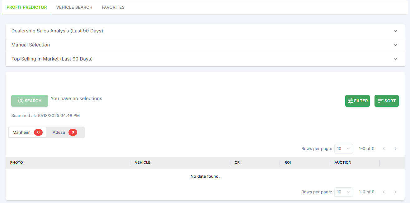 On this tab, you can search for a specific dealership to perform a Dealership Sales Analysis for the last 90 days and look for specific vehicles in Manheim and Adesa. You also have the option to manually select your vehicle’s year, make, and model (Manual Selection) to check their auction listings and view the Top Selling vehicles in your market (last 90 days) for your region.