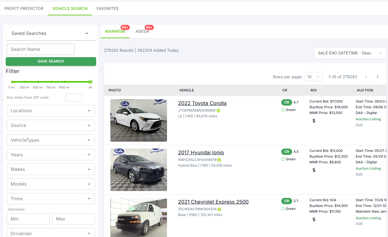 After selecting the vehicles, click “Search” to see all available listings in Manheim and Adesa.